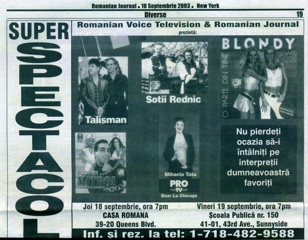 Romanian Jurnal 10 septembrie 2003 Date 10 septembrie 2003 Time 12:00 am Super Spectacol..Talisman, Blondy, Cornelia si Lupu Rednic, Mihaela Tatu.